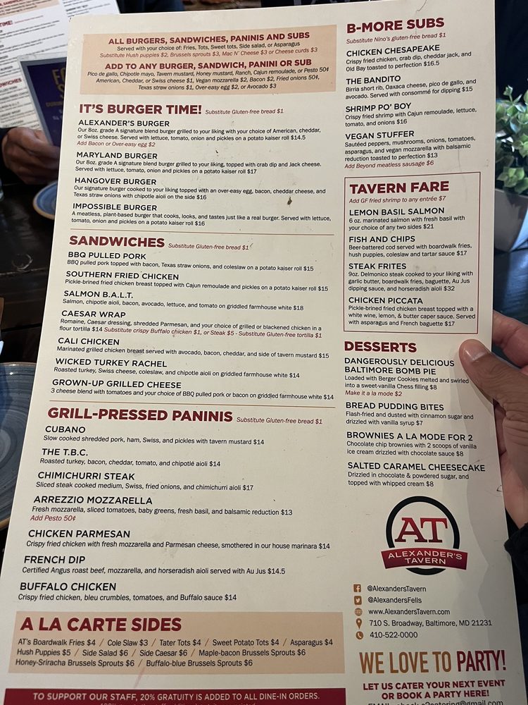 “ My wife and I have been ordering take out from Alexander's Tavern a lot lately. Probably 5 times or more in the past month. My wife is gluten sensitive, so it was surprising to us that they had gluten friendly options. Our go-to order is the chicken parm sandwich w/ crispy tots, and their buffalo wings. I think as of now, Alexander's wings are my favorite. One thing I can't stand about wings is if they aren't crispy and if you can still see the hairs on the skin. You don't have to worry about that here. The staff is great and friendly. We came to pick up our order two separate times. Typical Baltimore bar in terms of ambiance, but they serve good food and the people who work here are great. ”